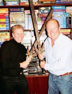 Among the items being auctioned at FIGHTING FANTASY FEST will be two swords, currently owned by Ian Livingstone, made to promote the Deathtrap Dungeon video game, and seen here in the hands of the Warlocks of Firetop Mountain.