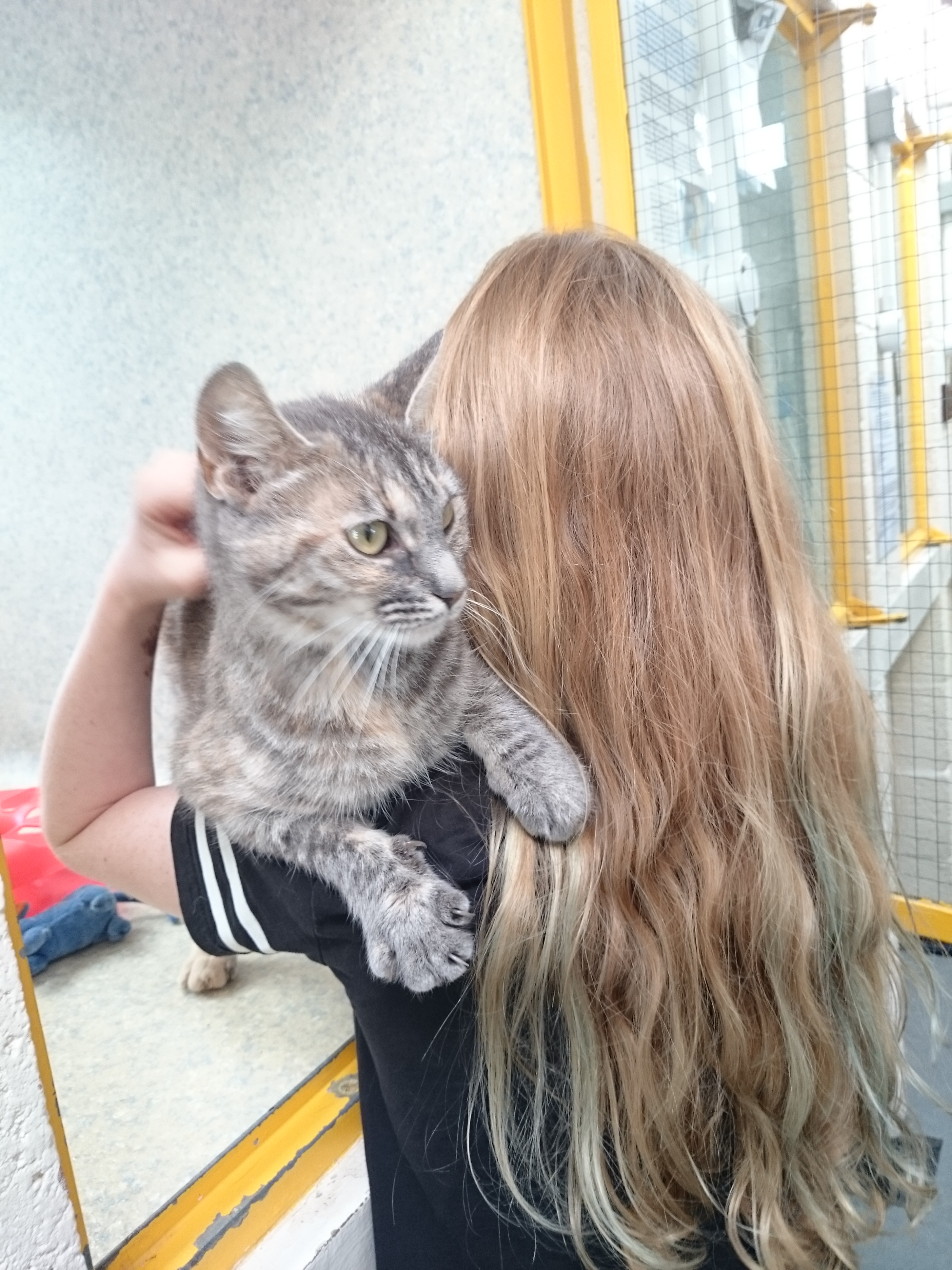 As I was walking along past all the other cats, Holly aka Marceline, made her presence known. She is an absolutely beautiful looking cat, so I decided to open the door and give her a bit of a stroke. Oh my God, she purred fit to burst. She was also a headbutter (which I love), and just couldn’t get enough attention. I tried a tentative tummy stroke and she didn’t sever any arteries so that was a plus. Next step was picking her up. She bloody loved it and settled right in, her purring going up a notch.